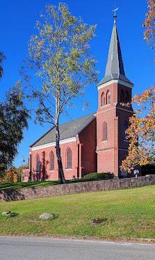 Klassisk mursteinskirke plassert på stor kirkegård.
